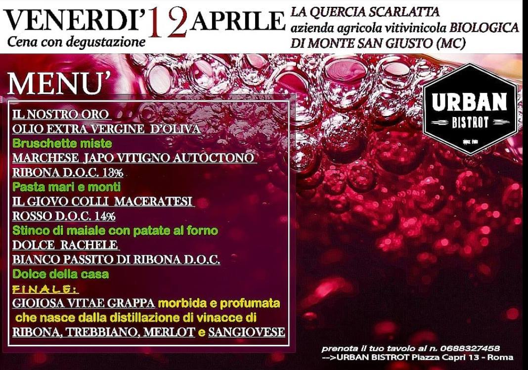 Noi de LA QUERCIA SCARLATTA, e’ lieta di invitarti all’URBAN BISTROT per una cena con degustazione.